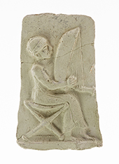 Harps are known from the earliest period of written history, but the fringed robe and close-fitting cap of this harpist are typical for the early second millennium B.C. in Mesopotamia. Clay plaques from this period depict musicians playing a variety of stringed, percussion, and wind instruments. The casting of plaques was a simple and inexpensive way to produce relief images, since numerous plaques could be made from a single mold.