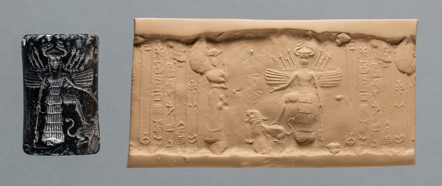 This seal was created in honor of the goddess Ninishkun, who is shown in the seal with the goddess Ishtar. Ishtar is restraining a lion with a leash, and she is holding a scimitar in her left hand.